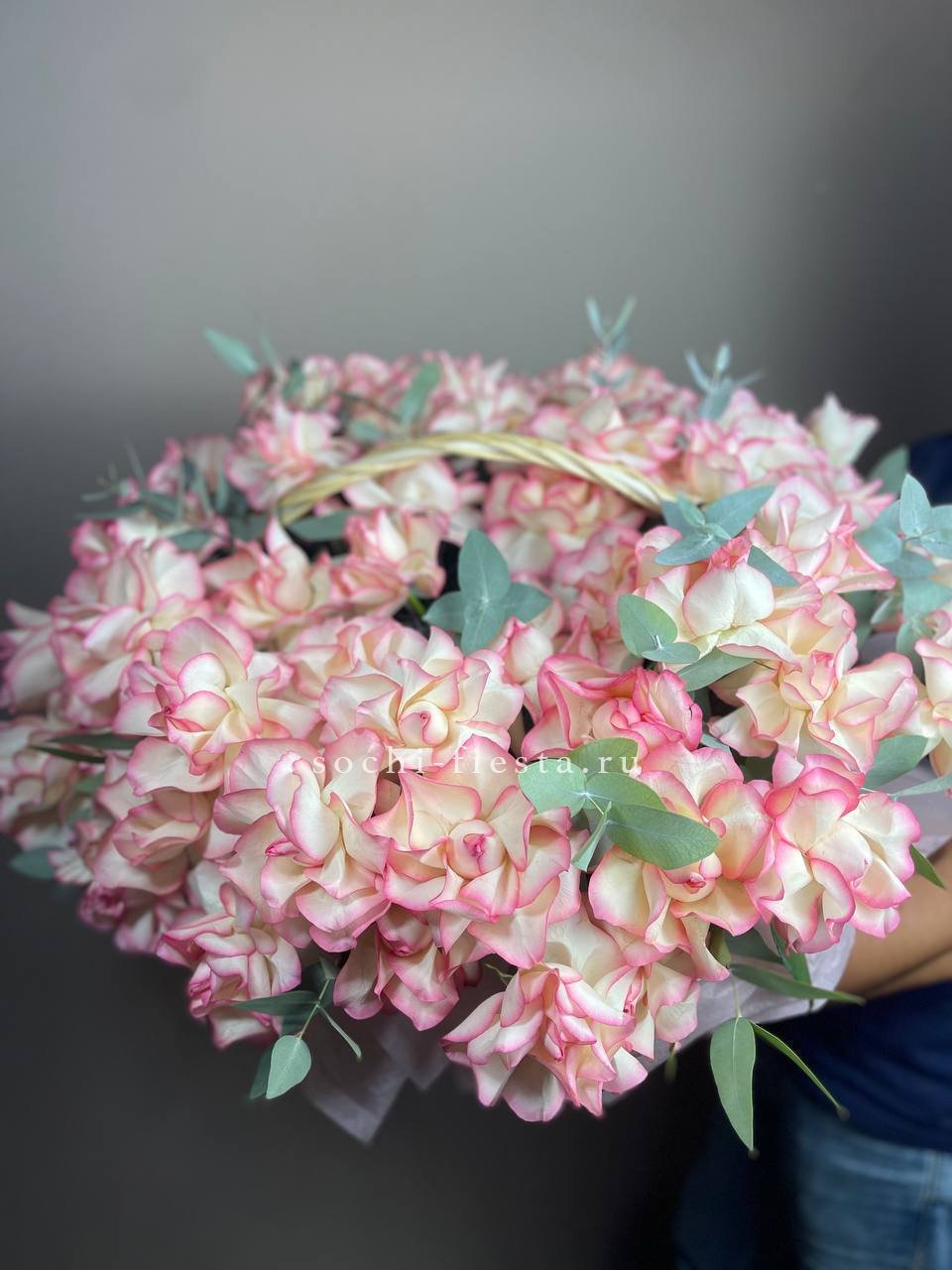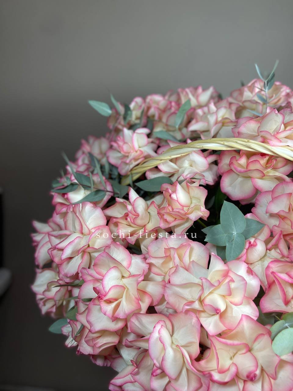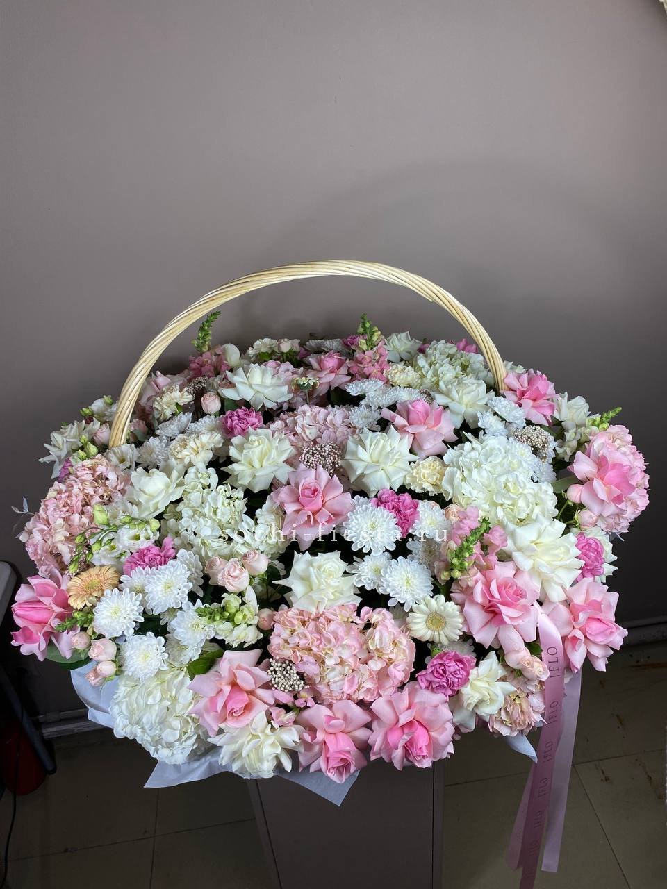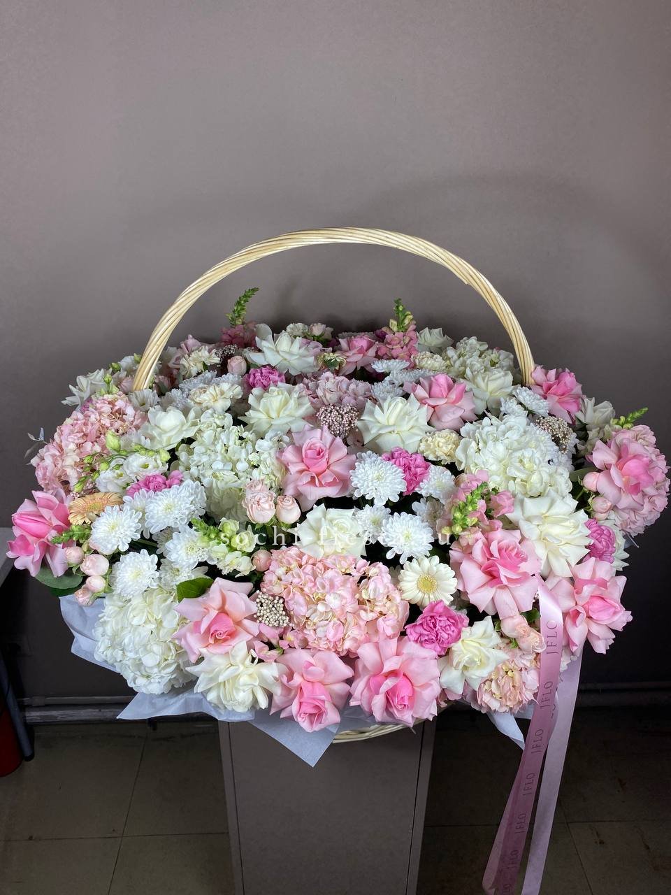 Воздушные соцветия эустомы собраны в округлую композицию с мягким переходом пастельных тонов. Светлая корзина создает легкую базу для объемной цветочной шапки.