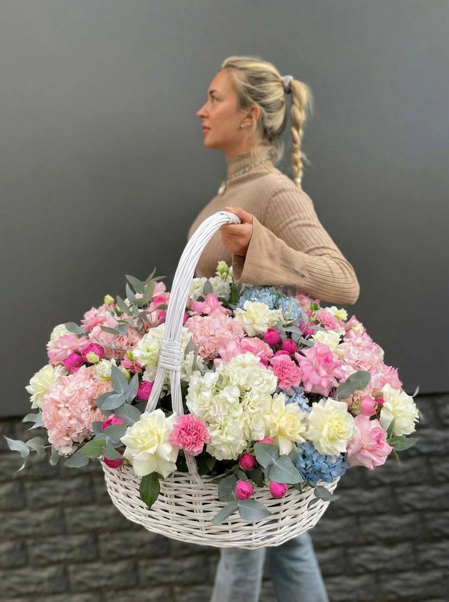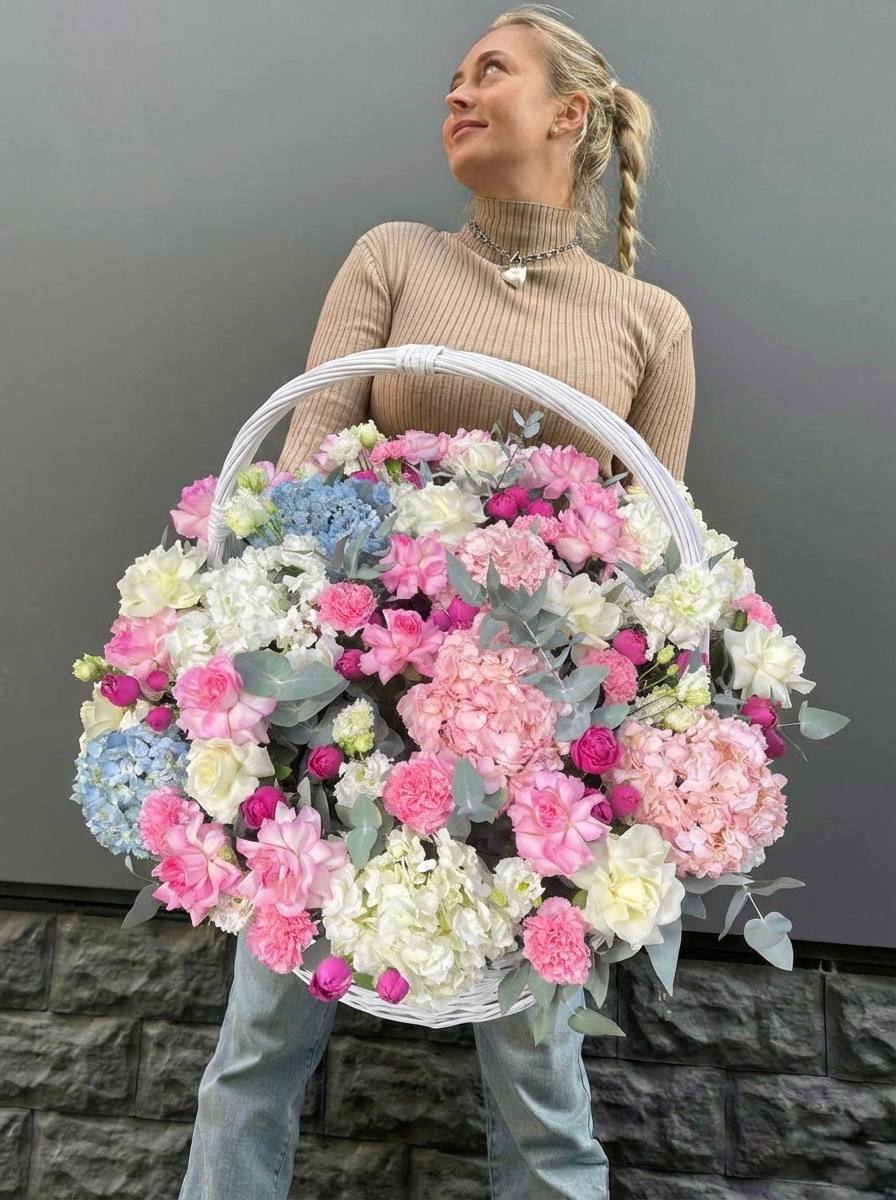 Пышная шапка гортензий в обрамлении воздушных соцветий Мисти Баблс создаёт объёмную композицию в светлой корзине. Эвкалипт добавляет зелени и завершает природную гармонию.