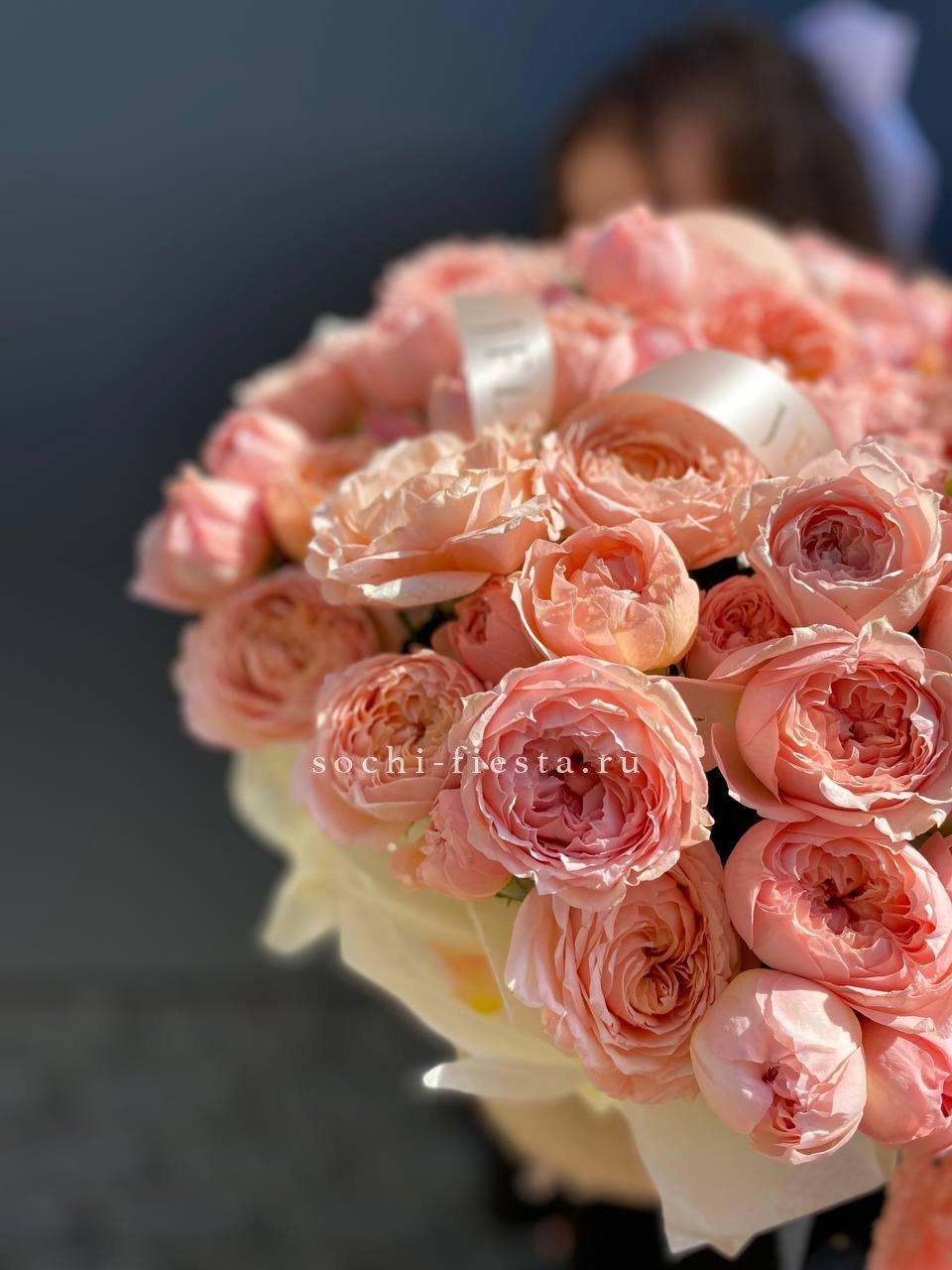 Пионовидные кустовые розы Джульетта с их густомахровыми бутонами создают объемную текстуру. Каждый цветок раскрывается слоями, формируя плотную и выразительную композицию в джутовом кашпо.