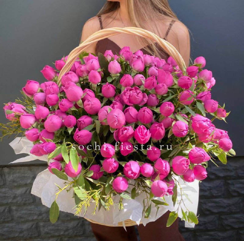 Пятьдесят один бутон Мисти Баблс собраны в плетёную корзину и образуют плотную цветущую полусферу. Лавандовые оттенки раскрываются постепенно и держат форму долго.