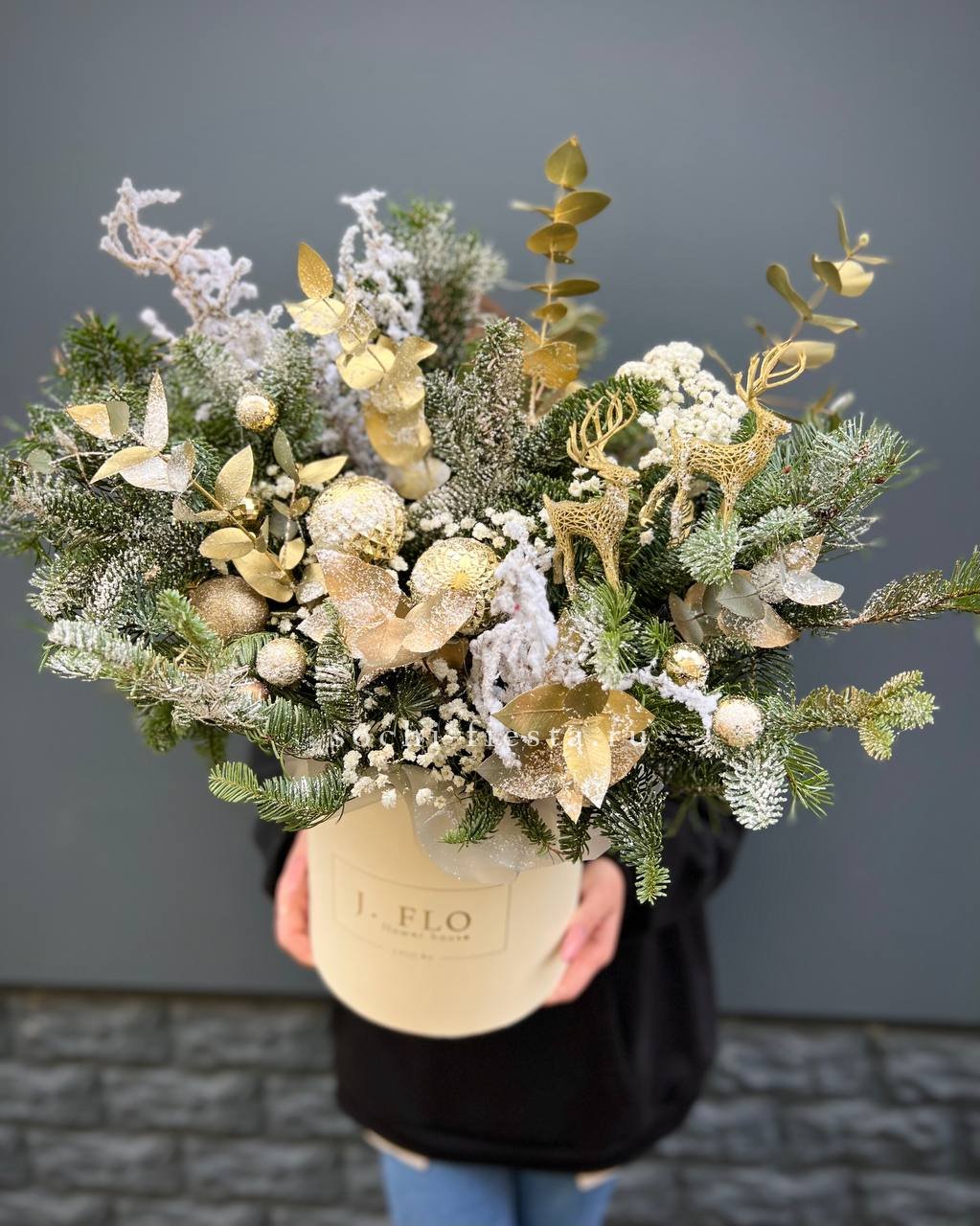 датский нобилис и ель образуют основу праздничной композиции в кашпо. Свеча и ёлочные игрушки дополняют образ, создавая готовое решение для новогоднего интерьера.