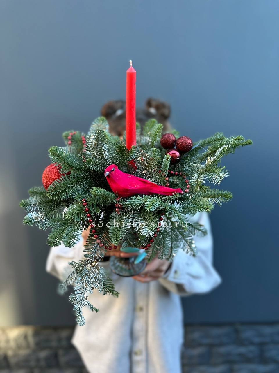 Свечи погружены в зелень нобилиса и окружены праздничными шарами. Композиция собрана в стеклянном бокале на флористическом оазисе. Завершённая форма для стола или камина.