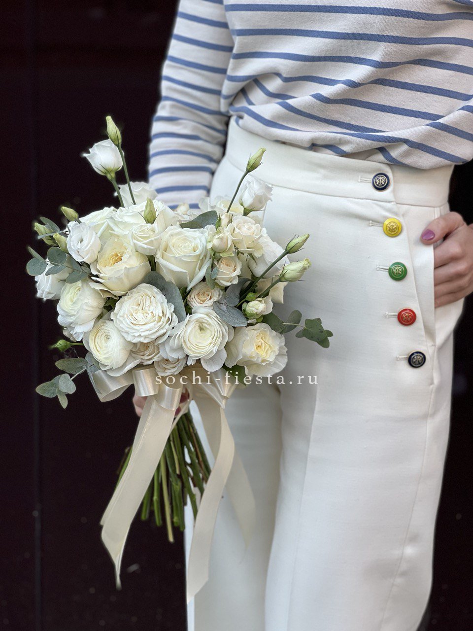 Двадцать один белый диантус собран в плотную округлую форму с серебристыми ветками эвкалипта. Классический свадебный букет с аккуратным силуэтом и атласной лентой на ножке.