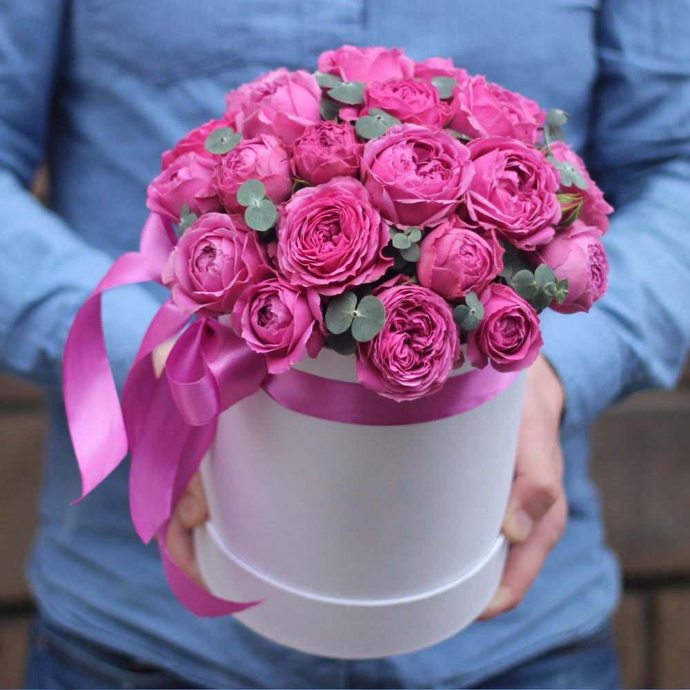 Семь пионовидных роз образуют компактный букет с мягкими линиями и спокойным ритмом. Ветви эвкалипта добавляют воздушности и завершают композицию.