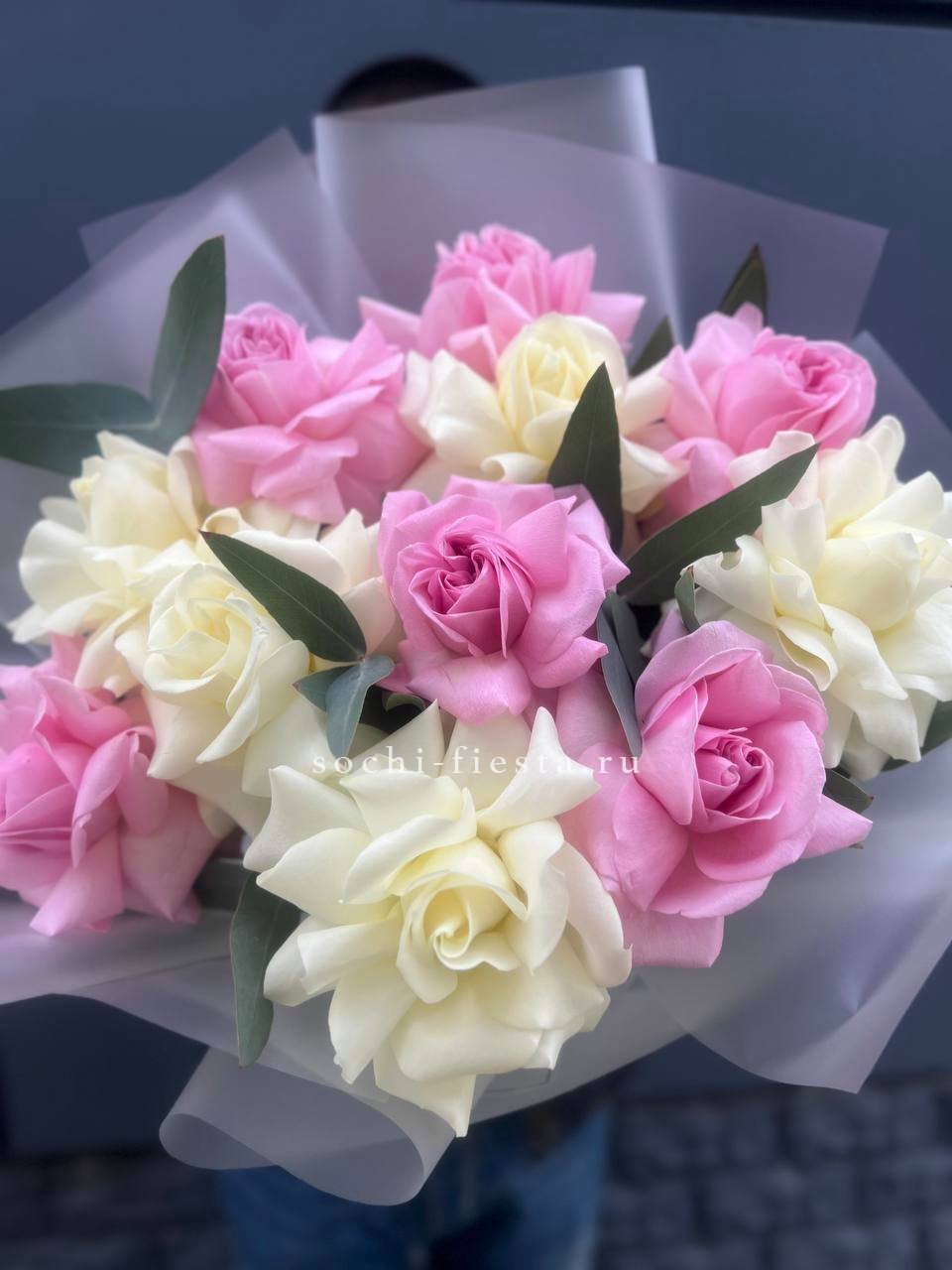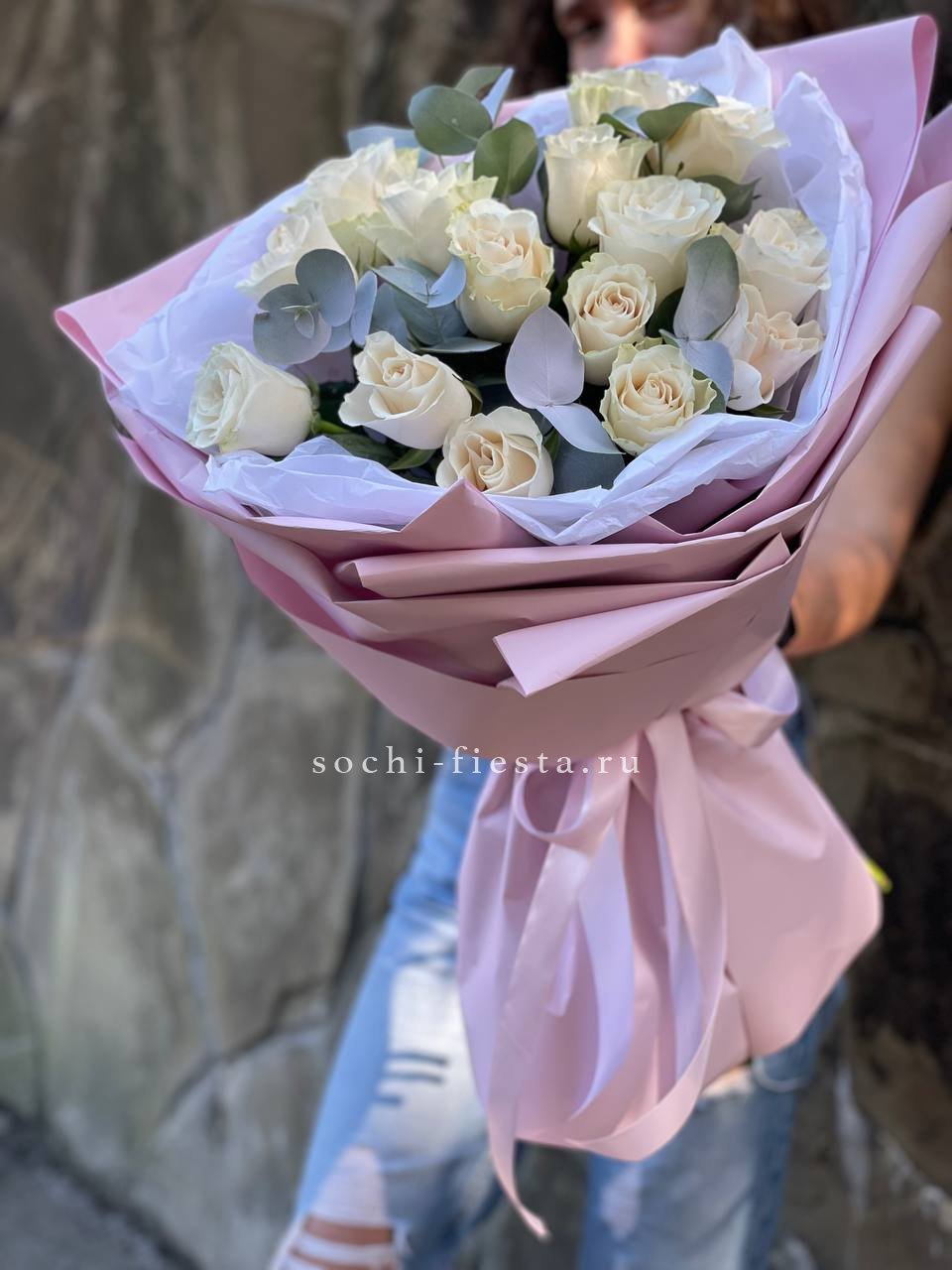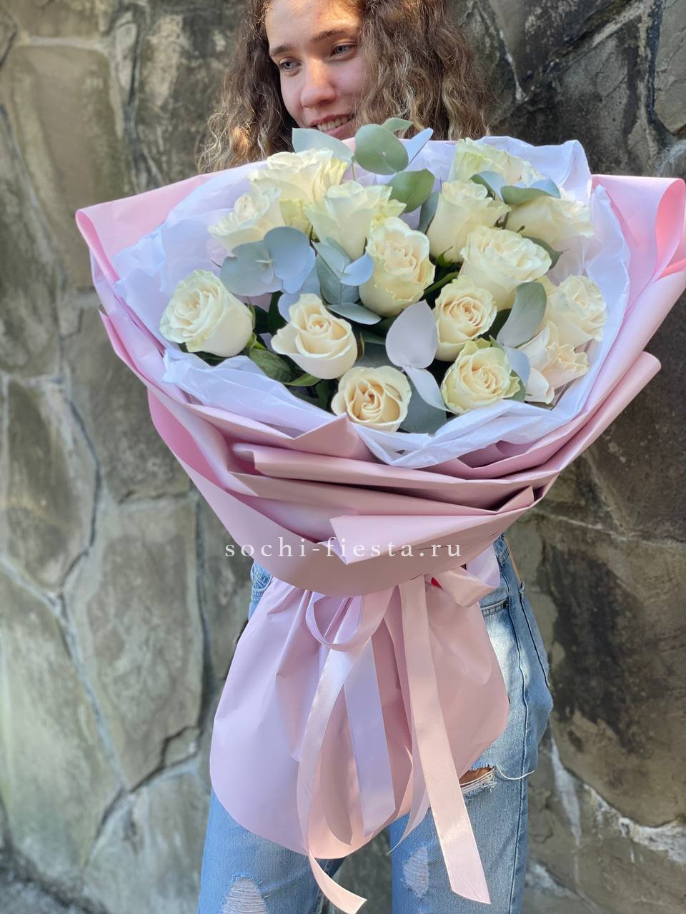 Двадцать пять вывернутых бутонов формируют объемную композицию с выразительным присутствием. Белые лепестки и зелень эвкалипта создают ощущение простора и легкости.
