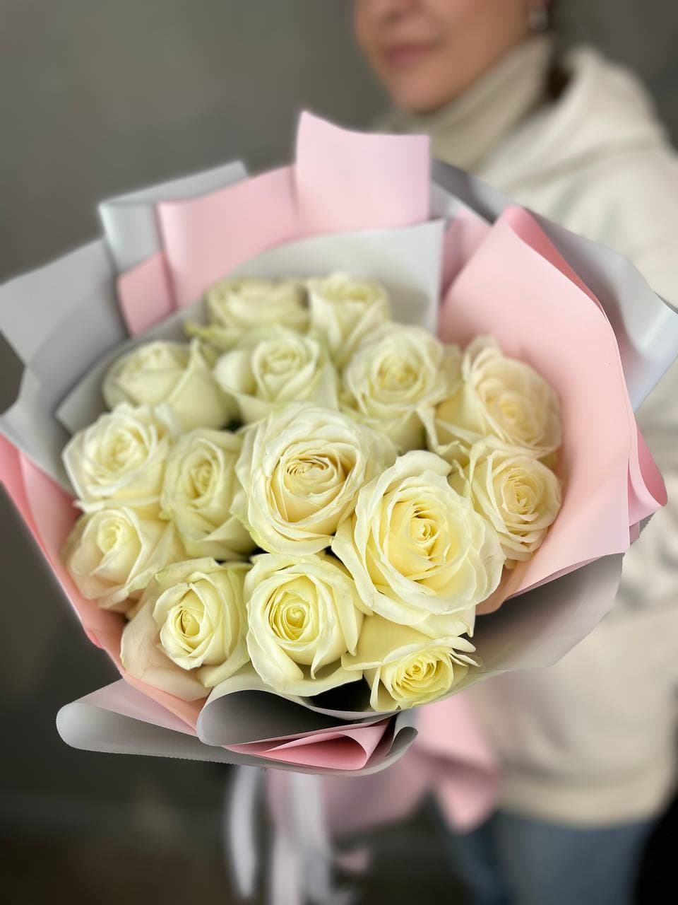 Двадцать пять белых роз образуют объёмную композицию с выразительным силуэтом. Плотная сборка и ритмичное расположение бутонов создают графичное впечатление.