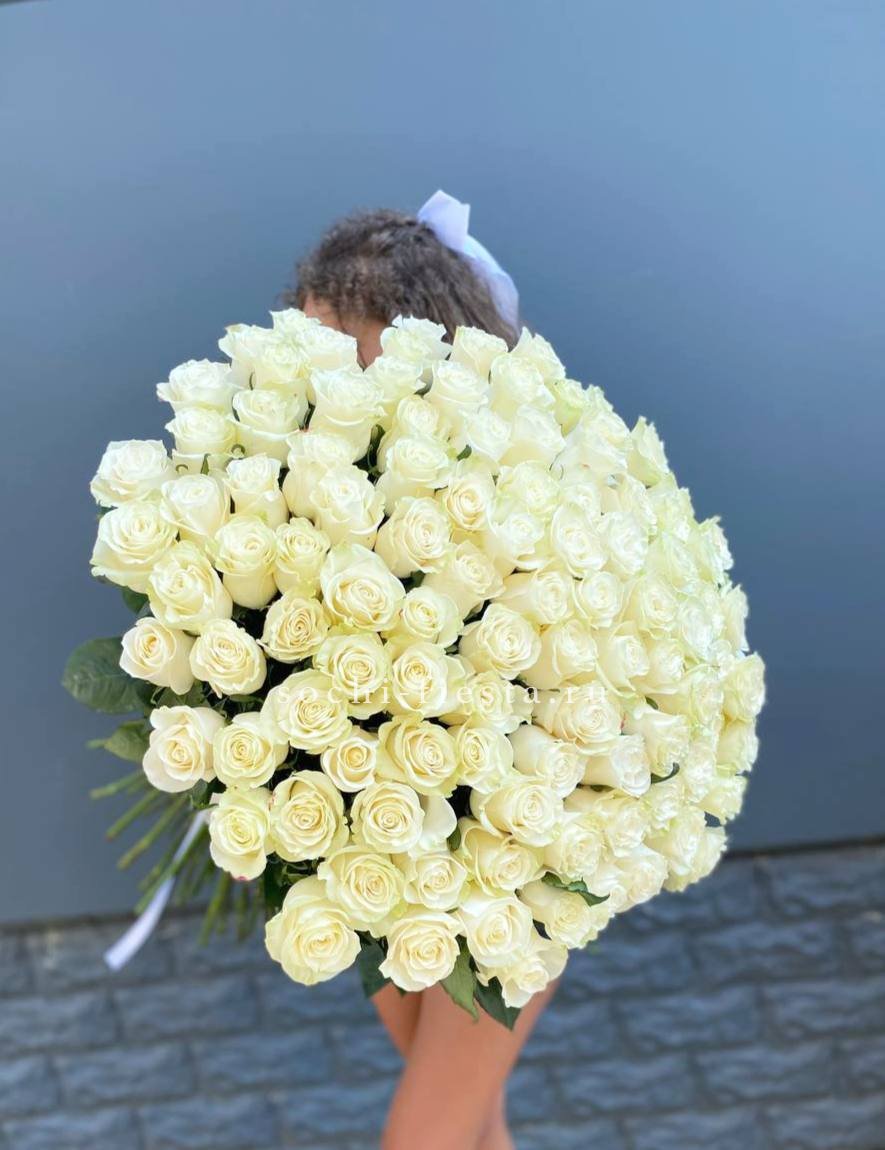 Тридцать пять белых бутонов образуют плотный монохромный ансамбль. Классическая форма и чистота оттенка позволяют букету звучать самодостаточно в любом интерьере.