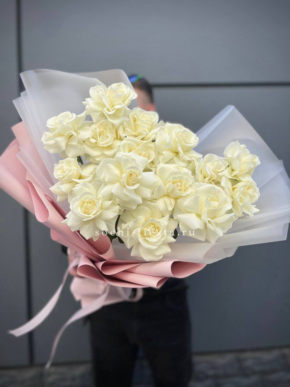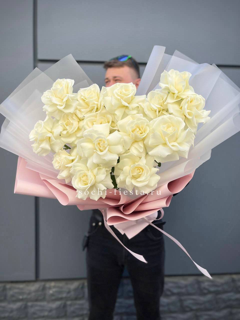 Пятнадцать белоснежных роз собраны в аккуратную форму с ровным силуэтом. Композиция сохраняет свежесть и держит структуру благодаря продуманному размещению бутонов в цилиндре.