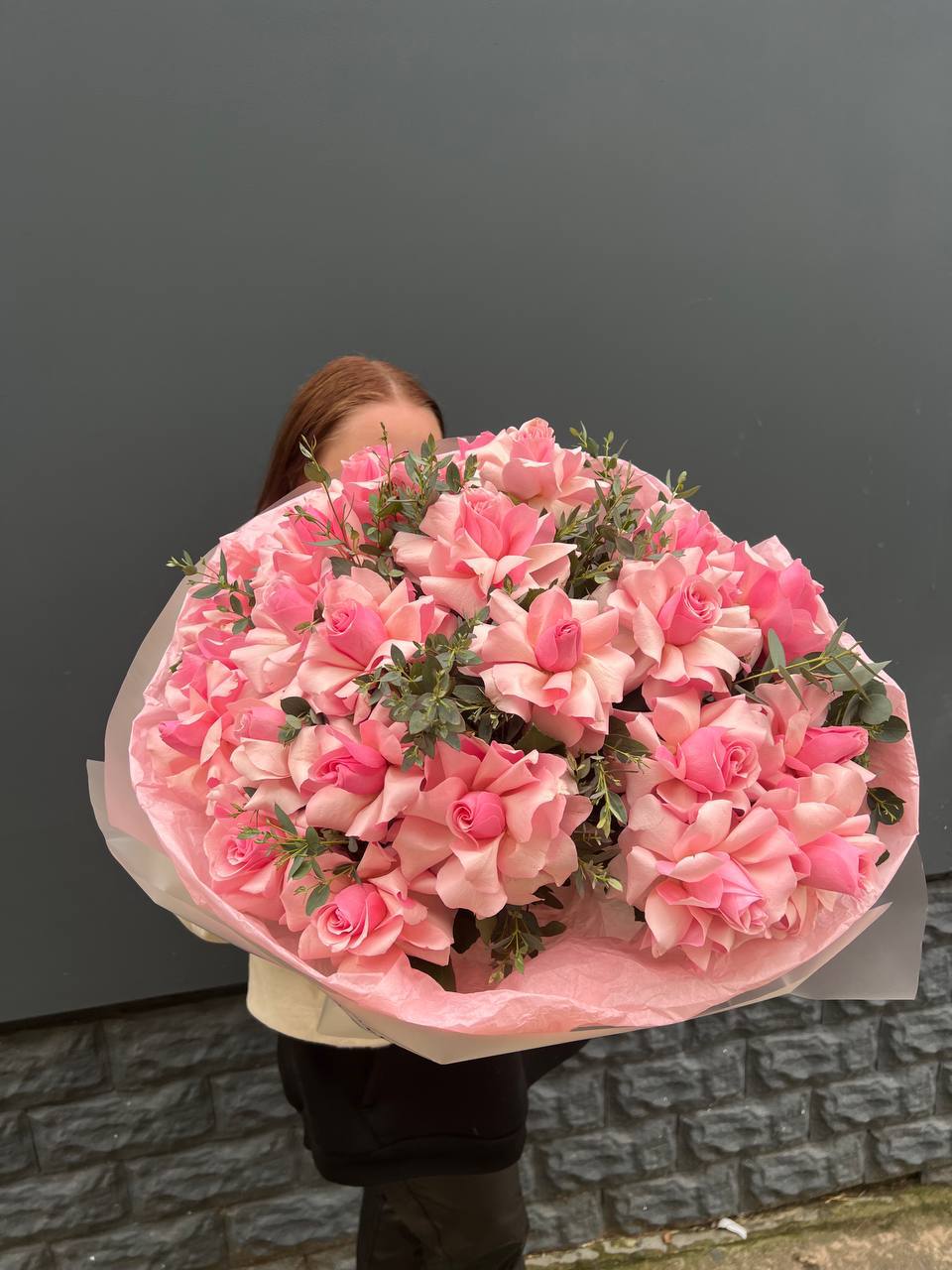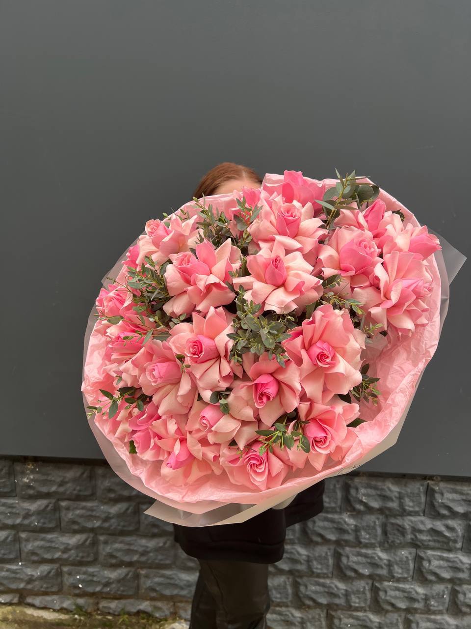 Вывернутые лепестки открывают внутреннюю структуру бутона и создают объемную фактуру. Эвкалипт добавляет зелени и глубины. Одиннадцать вывернутых роз собраны в плотную форму.