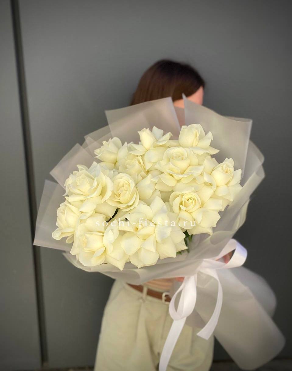 французские розы - 11 шт., эвкалипт-1шт, лента, авторская упаковка.
