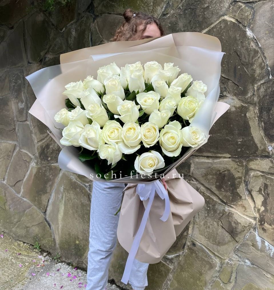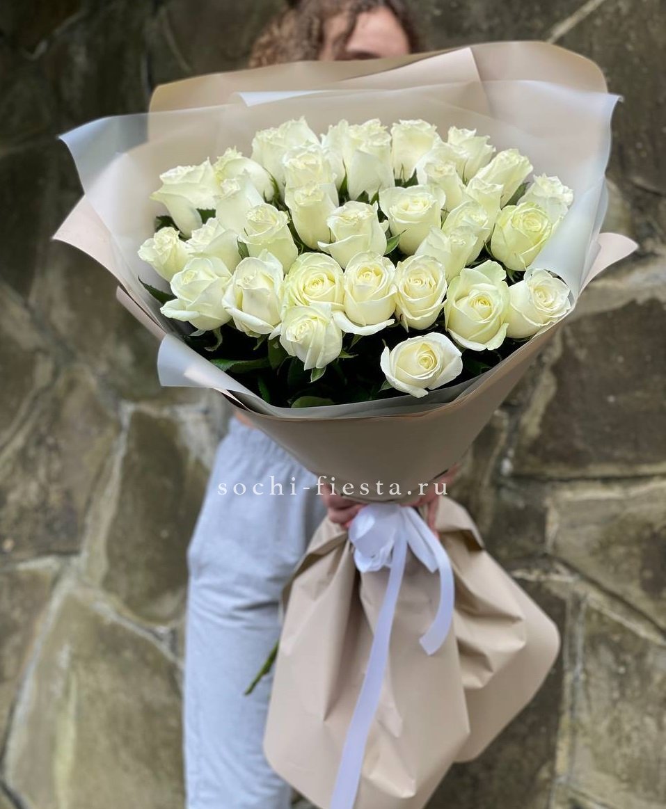 Двадцать пять белых бутонов раскрываются слоями и создают воздушную фактуру с глубиной. Голландские розы удерживают свежесть и сохраняют структуру долгое время.