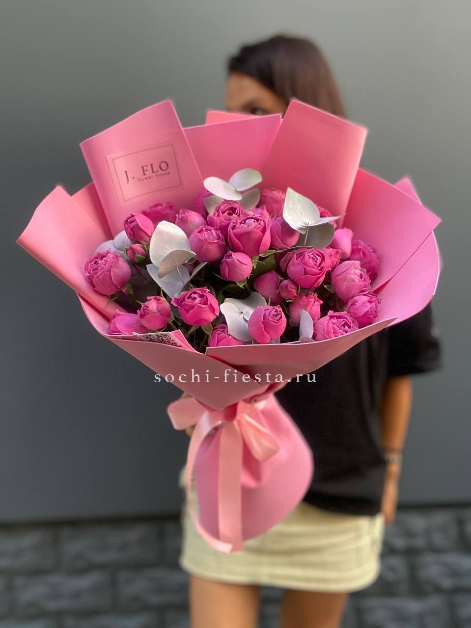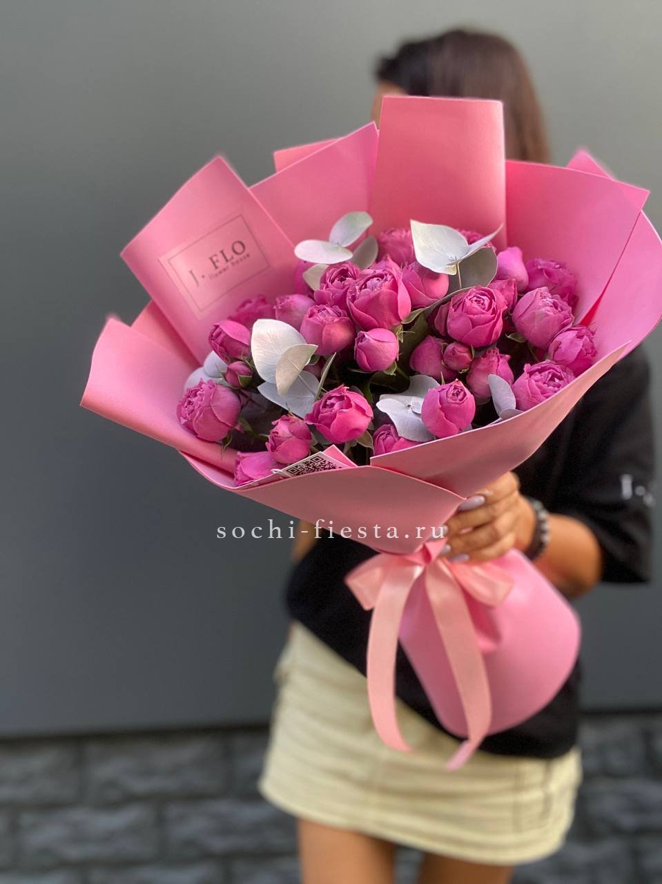 минимальный состав: 9 лавандовых пионовидных кустовых роз, лента, упаковка на выбор.