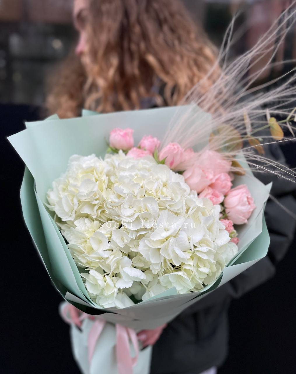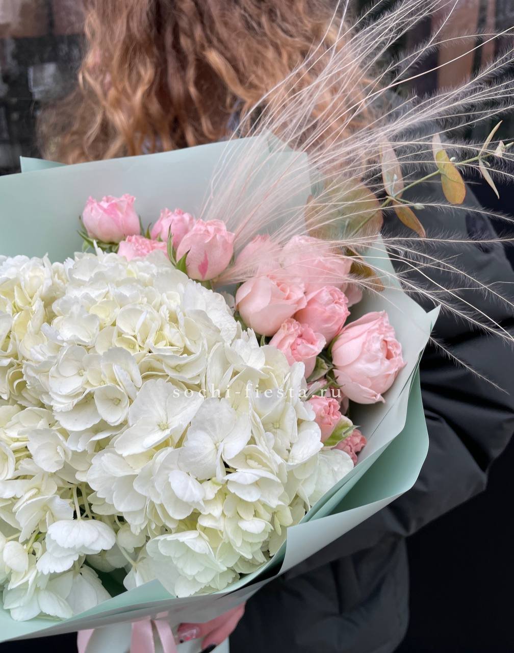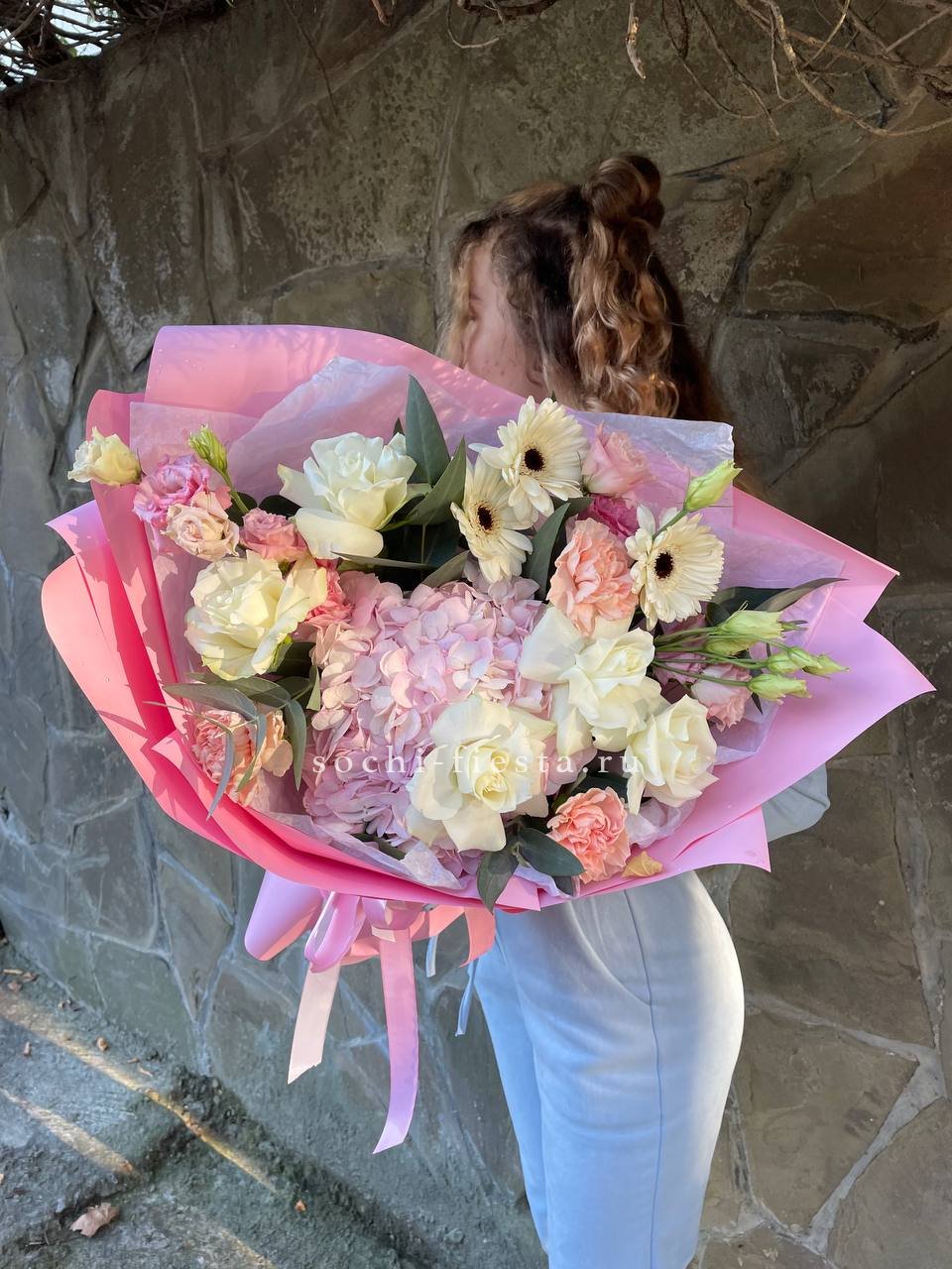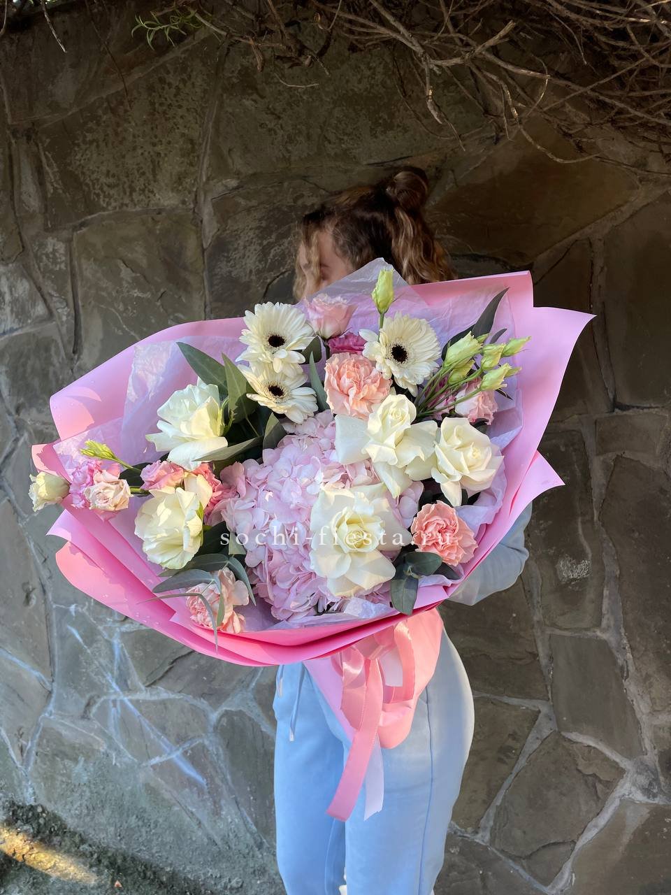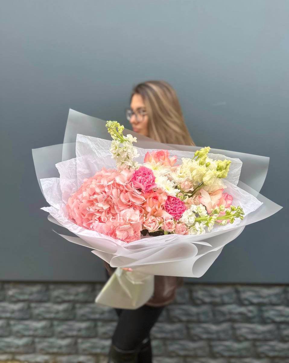 гортензия, герберы, эустомы, розы, диантус, эвкалипт, лента, дизайнерская упаковка.