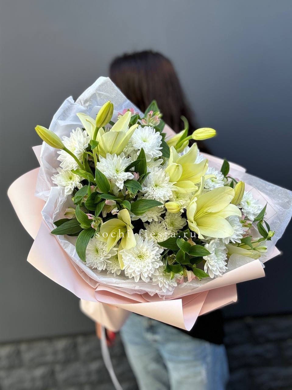 хризантема, лилия, альстромерия (возможна замена от сезона), упаковка.