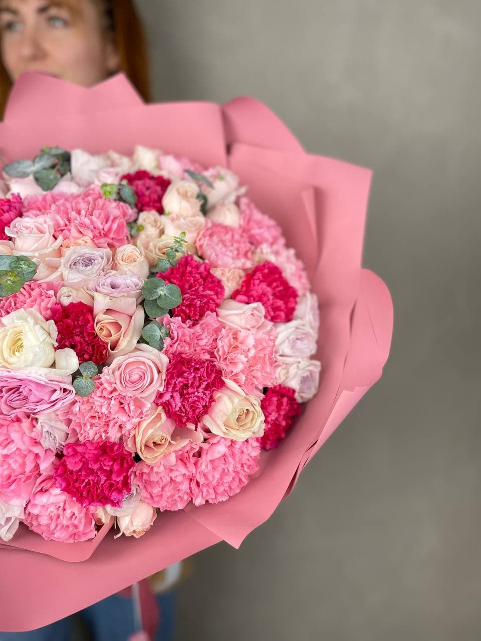 диантус, эустома, эвкалипт,  лента, дизайнерская пленка.