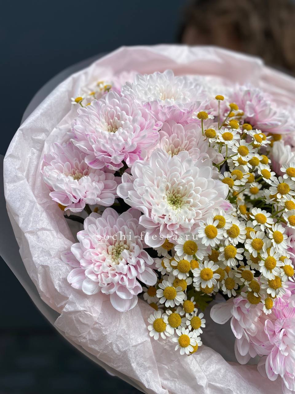 Белоснежные ромашки и кустовые хризантемы собраны в легкую композицию с открытой структурой. Прозрачная упаковка сохраняет воздушность и подчеркивает свежесть каждого бутона.