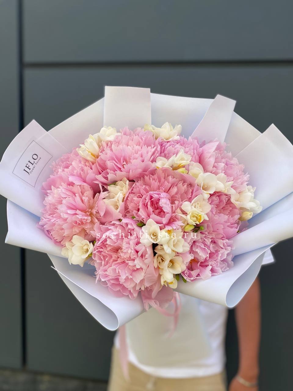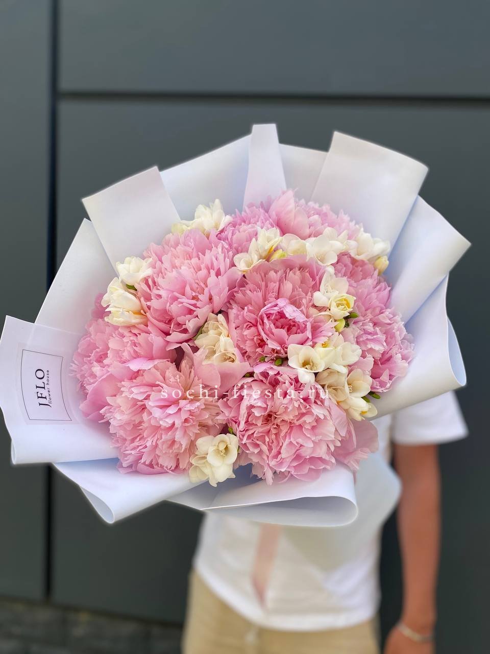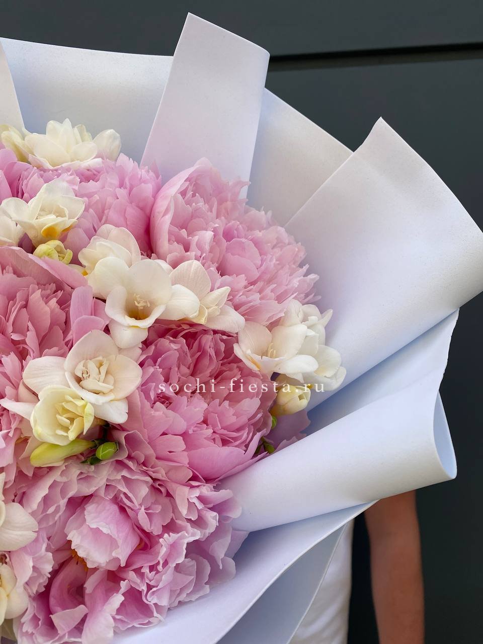 Пышные пионы встречаются с воздушными фрезиями в букете, который радует глаз многослойной структурой. Лепестки раскрываются постепенно, создавая живую композицию с выразительной глубиной.