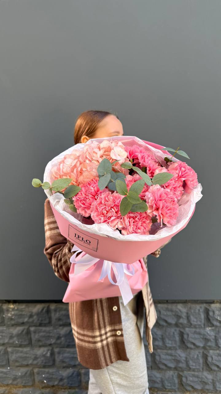 Крупные соцветия гортензии задают основной объем, а эустома и диантус разбивают плотность воздушными бутонами. Мисти баблс и озотамус рассыпаются между цветами, добавляя движение и легкость всей композиции.