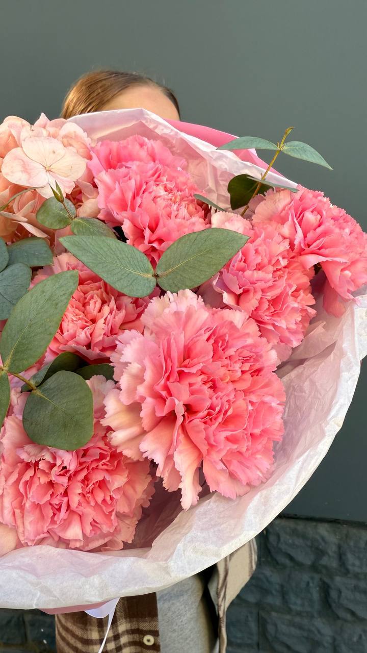 гортензия, эустома, диантус, мисти баблс, озотамус в нежном оформлении.