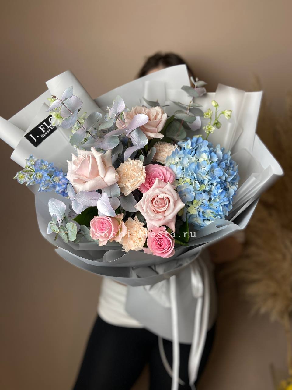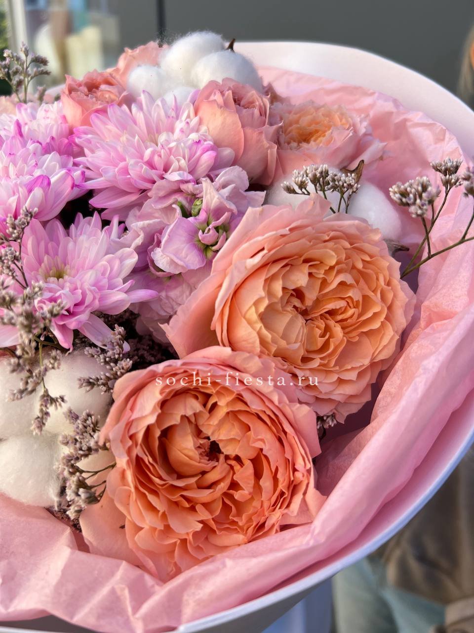 Пионовидные розы Джульетта с пышными шапками гортензии создают плотную композицию в пудровой гамме. Хлопок и лимониум добавляют воздушности, а кустовая хризантема заполняет пространство между крупными бутонами. Букет держит форму и долго сохраняет свежесть.
