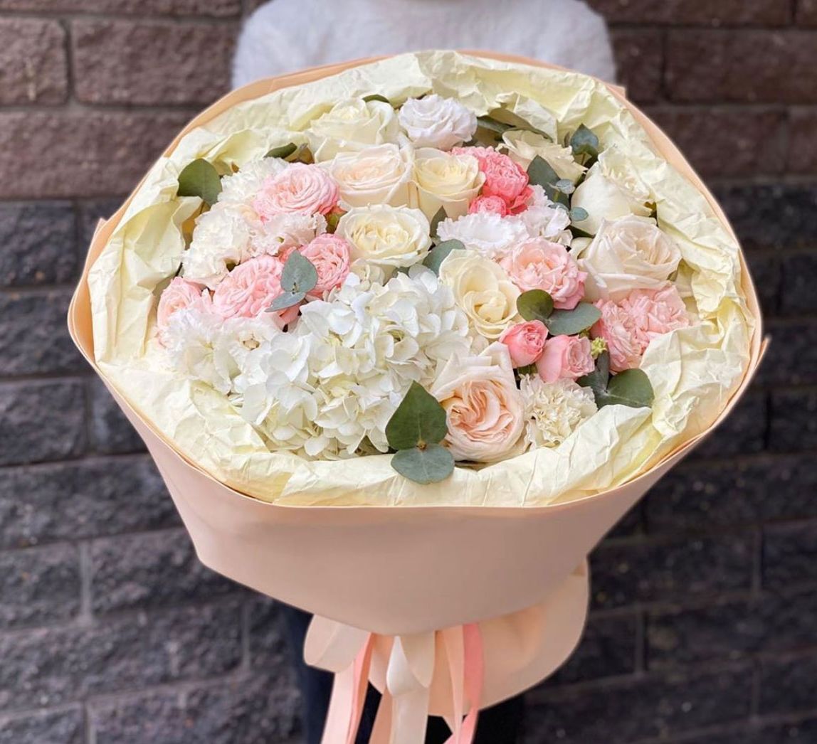 Пышные шапки гортензии задают объём, а россыпь кустовых роз создаёт живую текстуру по всей форме. Композиция наполнена воздухом и естественной лёгкостью.