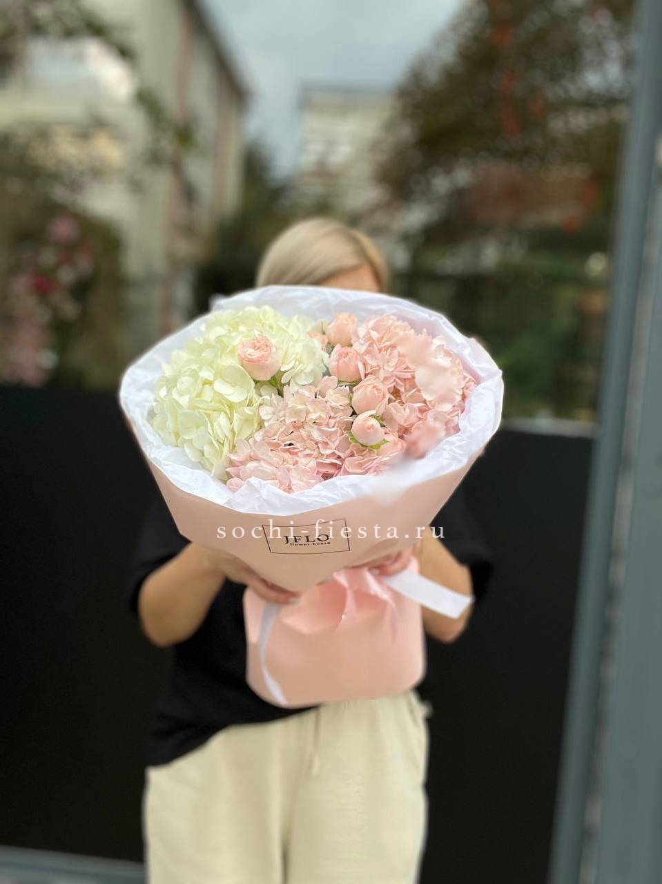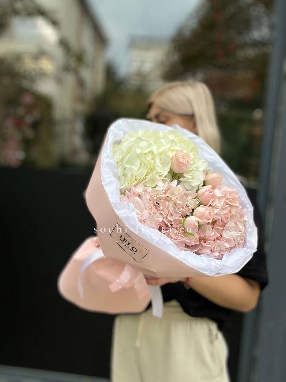 гортензия, диантус, хризантема, эустома, розы, озатамус, пленка.