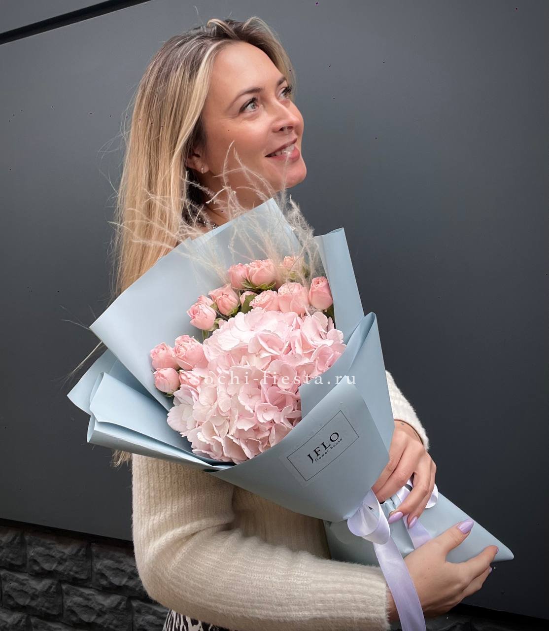 розовая роза, диантус, бомбастик, маттиола в нежном оформлении.