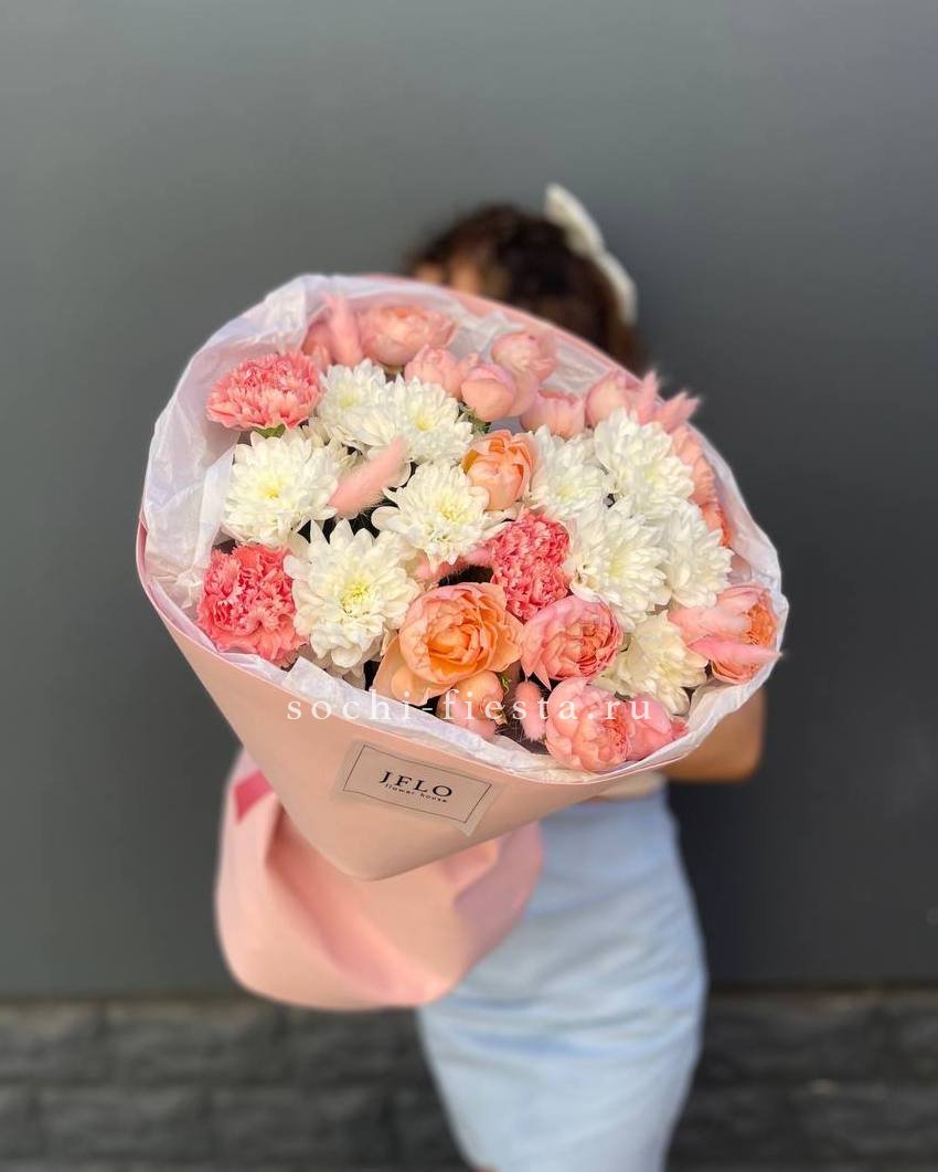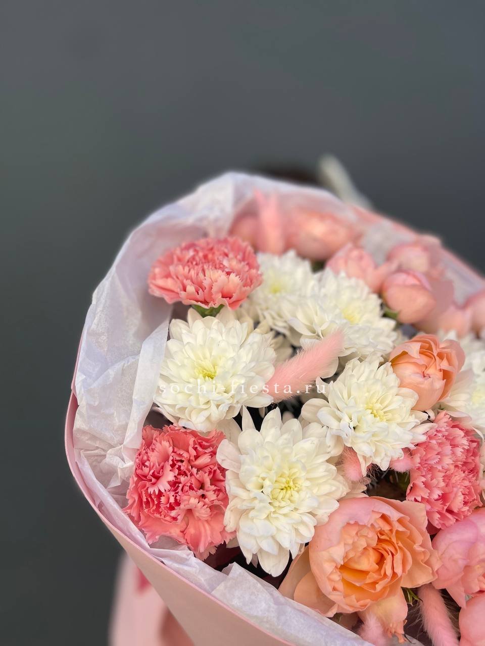 Розовые розы и диантусы окружены пышными соцветиями маттиолы и бомбастика. Композиция собрана плотно, каждый цветок поддерживает соседний, создавая объемную округлую форму. Букет держит силуэт и выглядит цельно с любого ракурса.