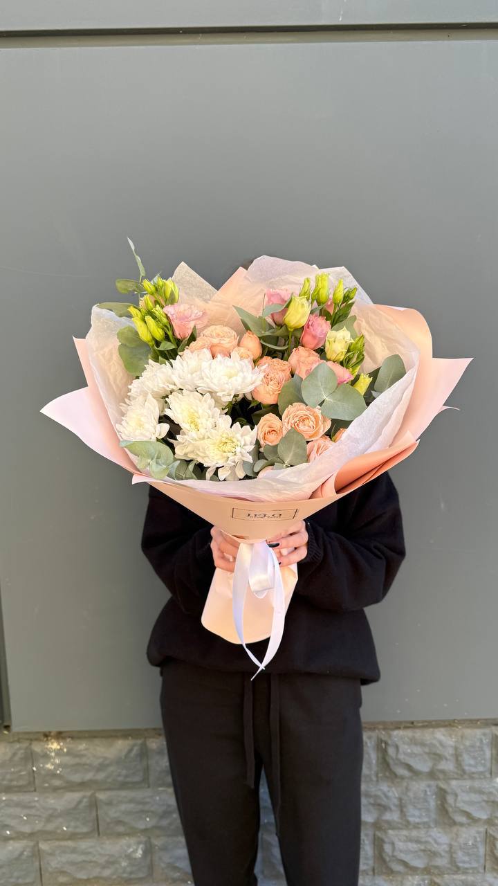 диантус, гербера, кустовая роза, роза белая, лимониум (замена в несезон), дельфиниум/маттиола/львиный зев/гладиолус (замена в несезон), лента, авторская упаковка.
