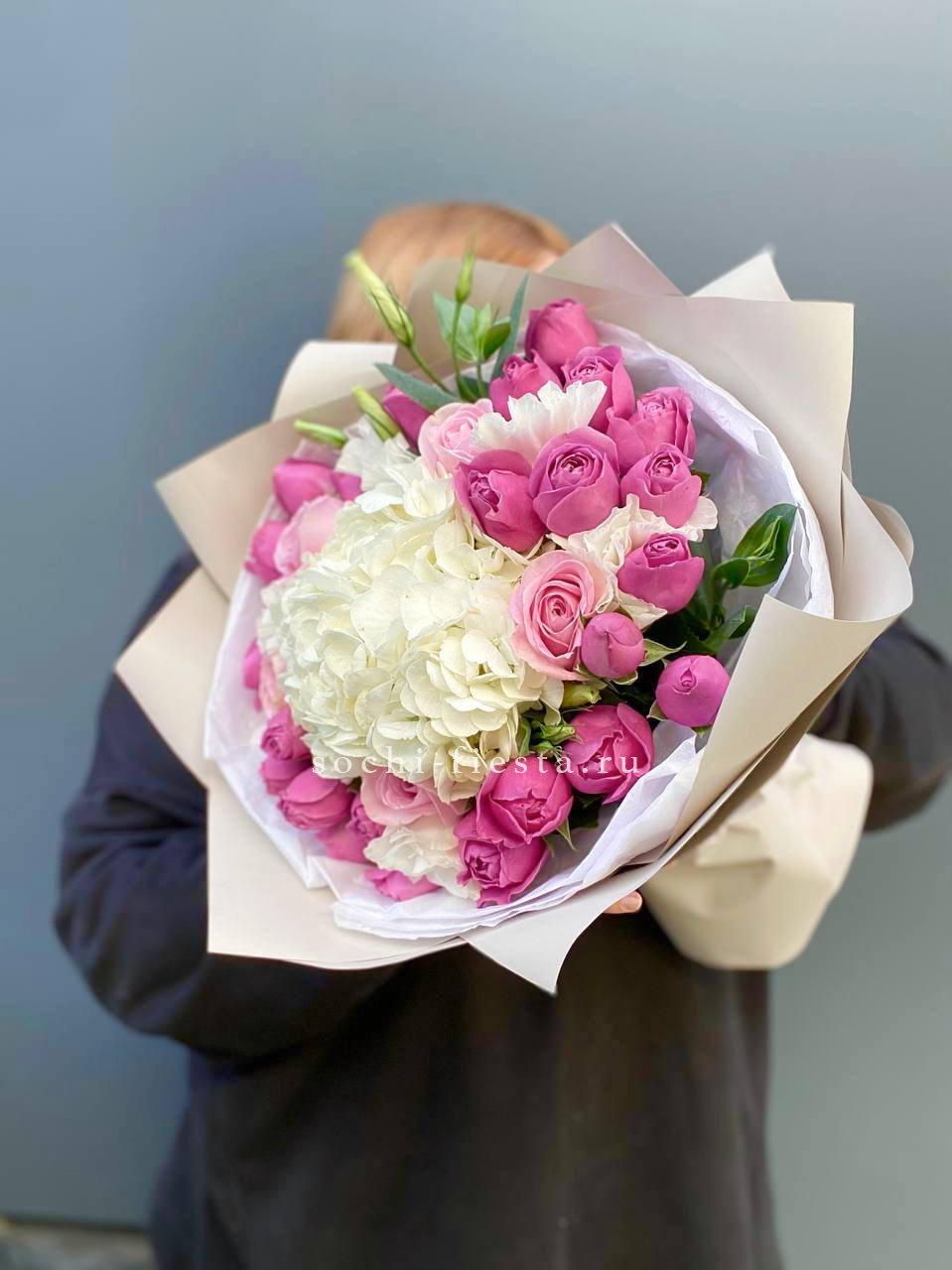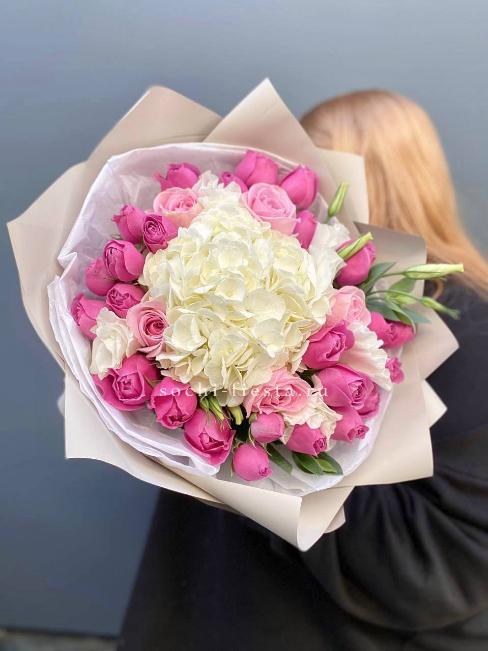 Воздушная композиция с крупными соцветиями гортензии и пышными розами создает ощущение легкости и объема. Эвкалипт добавляет свежести, а бомбастик расставляет яркие акценты между бутонами.