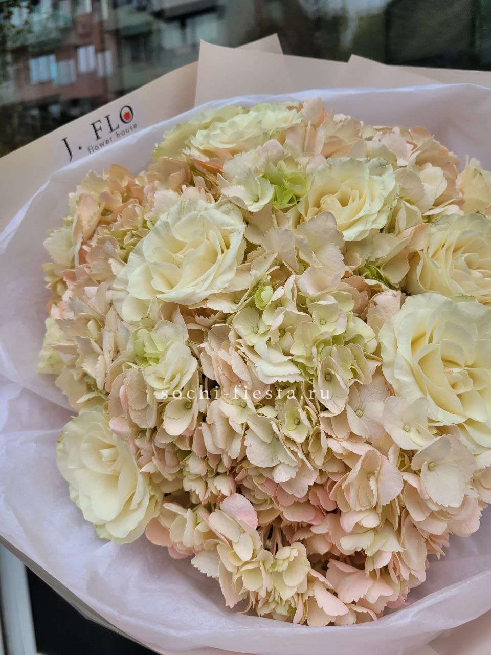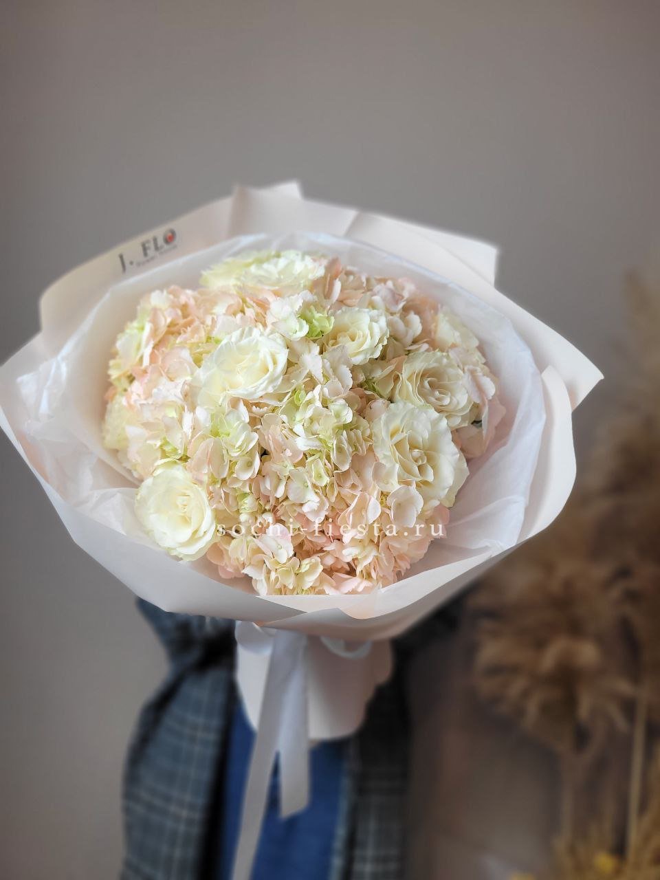 эвкалипт, гортензия, перо, кустовая роза, эустома, роза белая, диантус, упаковка.
