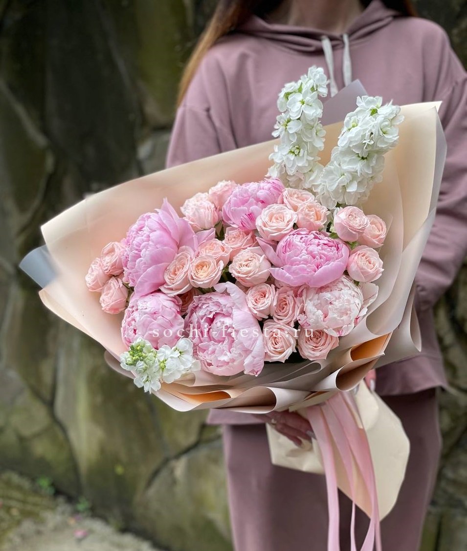 розовые пионы Сара Бернар, пионовидная кустовая роза, маттиола, лента, дизайнерская упаковка.