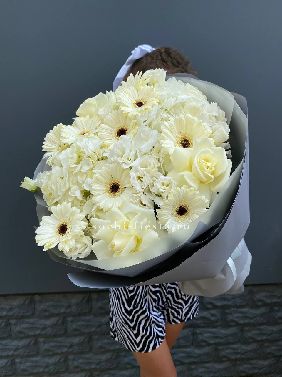 гербера, роза, хлопок, гортензия, диантус, эвкалипт, упаковка.