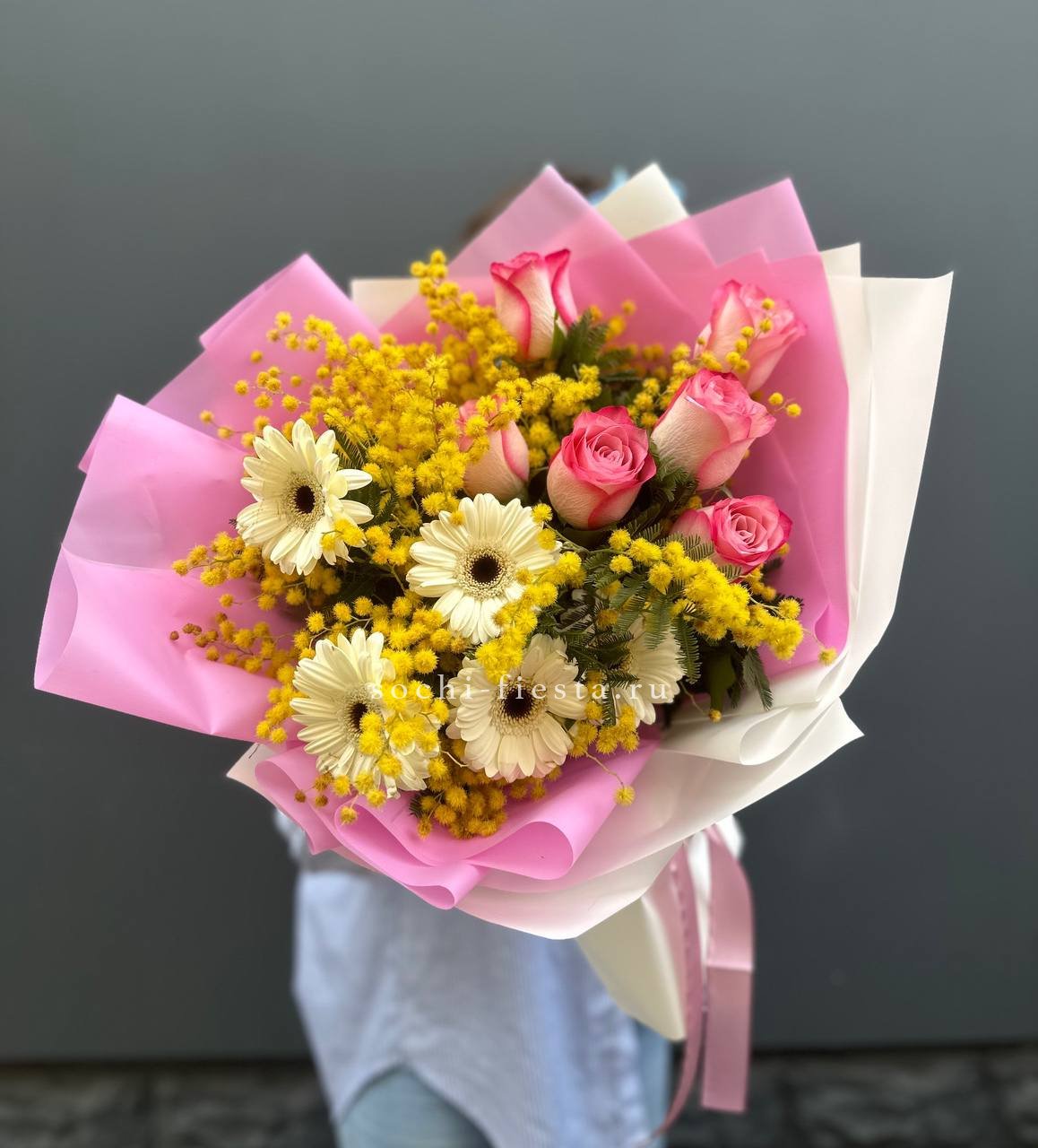 Солнечная мимоза встречается с яркими гербераами и розами Венди в жизнерадостной композиции. Тёплые оттенки создают весеннее настроение и дарят улыбку.