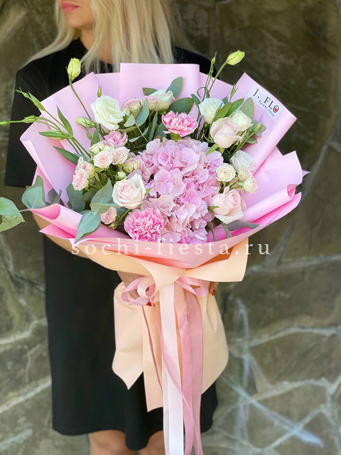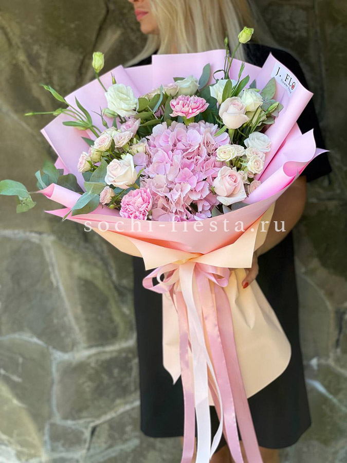 гортензия, розовые розы, кустовые розы, маттиолы,, лимониум лента и дизайнерская пленка.