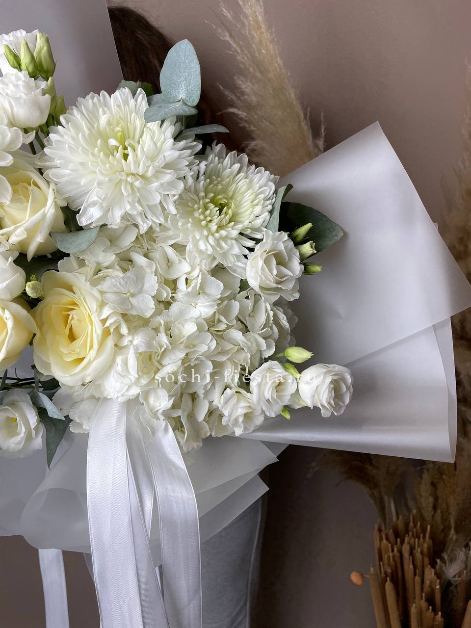гортензия, диантус, кустовая пионовидная роза, эустома, озотамнус, хамелациум (или аналог) эвкалипт, лента, упаковка.