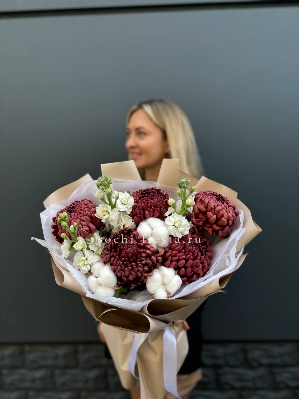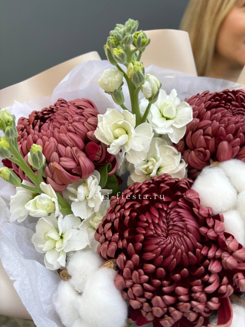 хризантемы, маттиола, лист чика, хлопок, лента, дизайнерская упаковка.