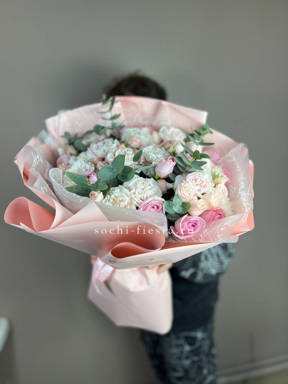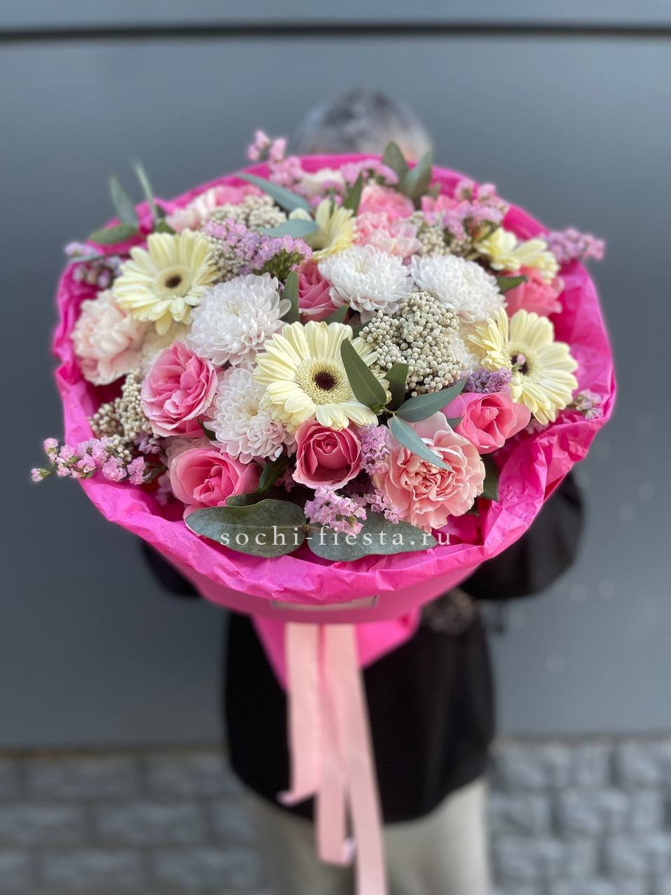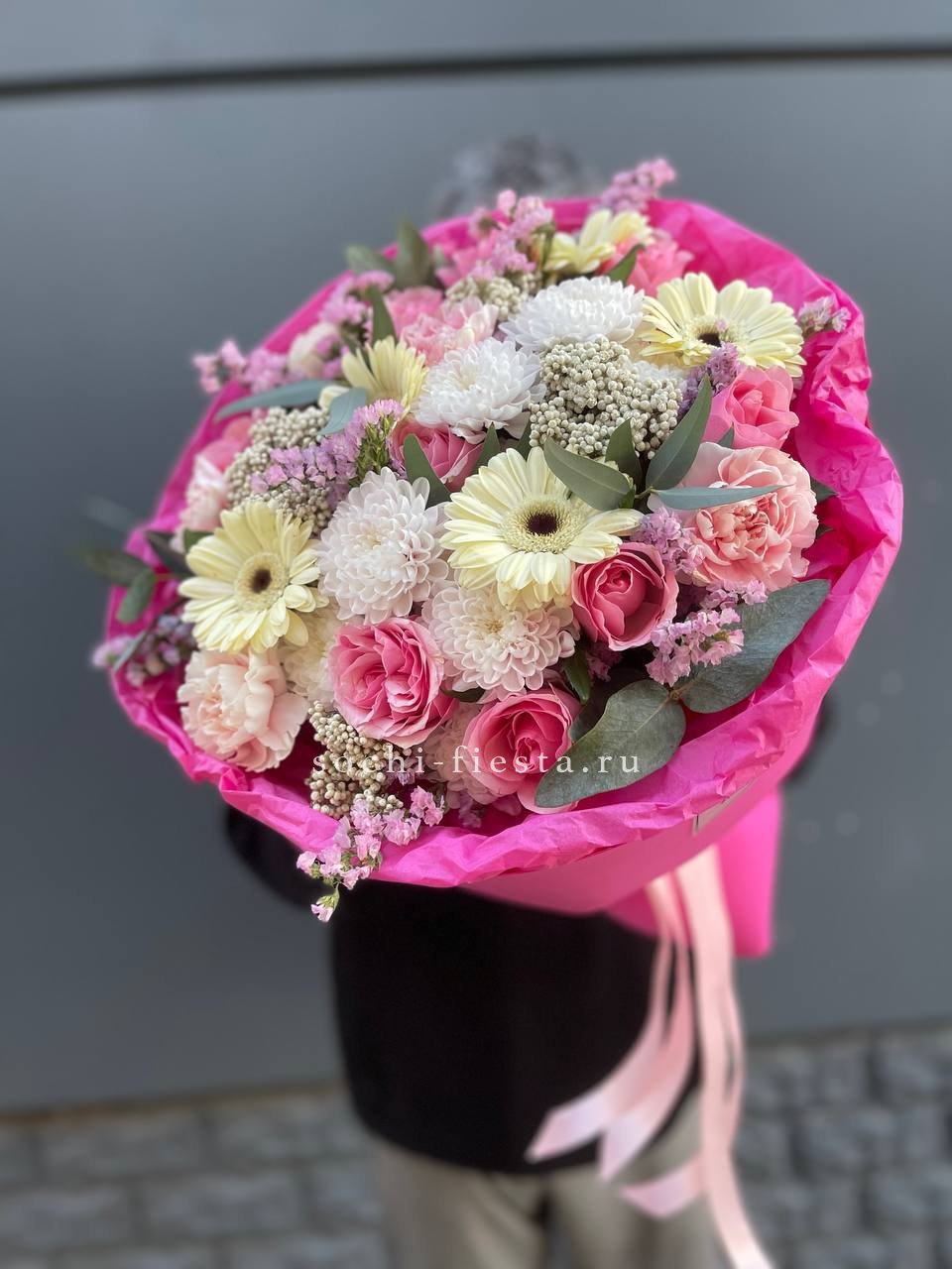 гортензия, гербера, диантус, эустома, свит ревиваль, кустовая роза, эвкалипт, лента, корейская пленка.