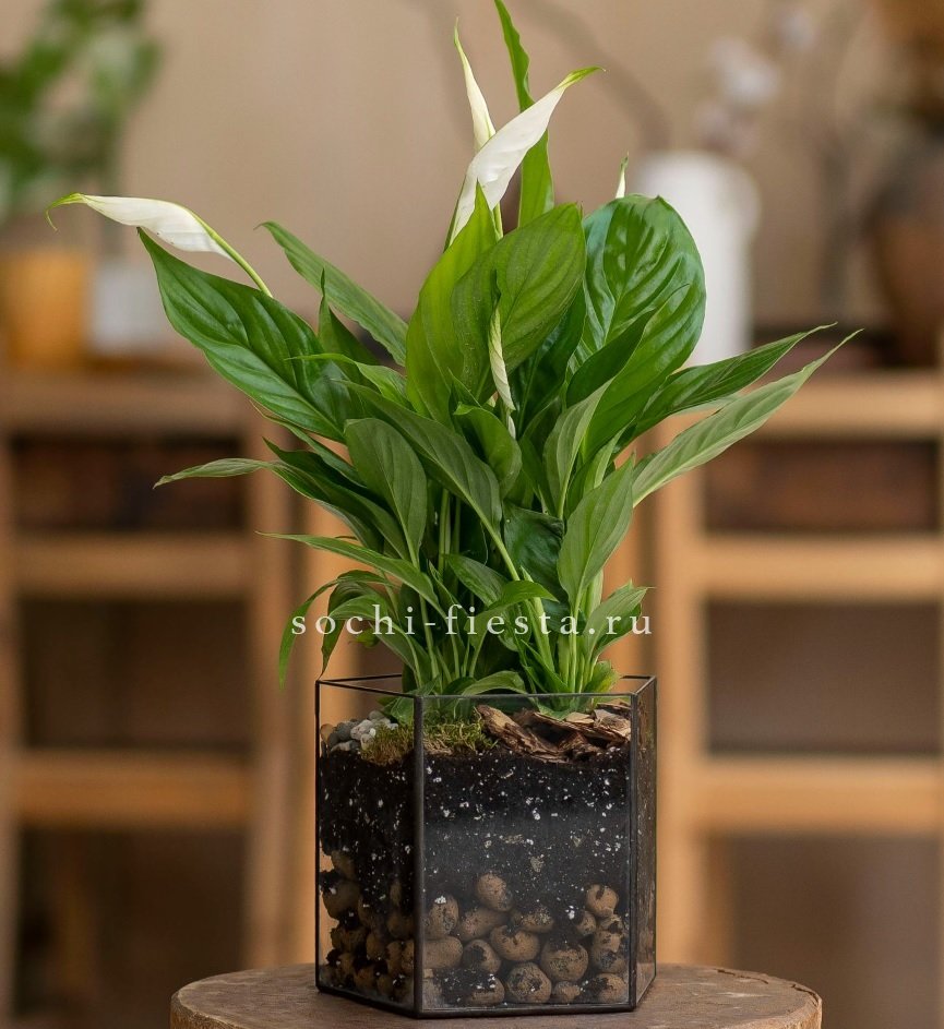Спатифиллум в геометрическом кашпо с пятью гранями создает графичный акцент в интерьере. Живая зелень требует минимум внимания и долго сохраняет свежесть.